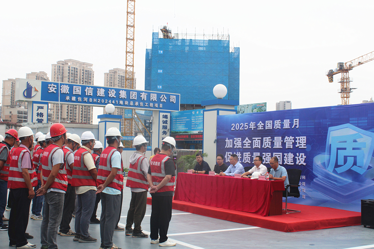 为积极响应2025年全国“质量月”活动号召,不断提高集团公司建设工程质量精细化管理水平,强化质量意识,9月19日上午,国信集团在BH202441地块项目部成功举办“质量大讲堂”活动。此次活动作为质量月活动的重要组成部分,旨在通过专业讲解和互动交流,增强质量责任意识和质量管理能力。包河区住房和城乡建设局质量安全监督科、合肥市包河区滨投乐居建设开发有限公司、安徽南巽建设项目管理投资有限公司、国信集团等单位相关领导,国信集团在建工程项目负责人、质量负责人等参加本次活动。